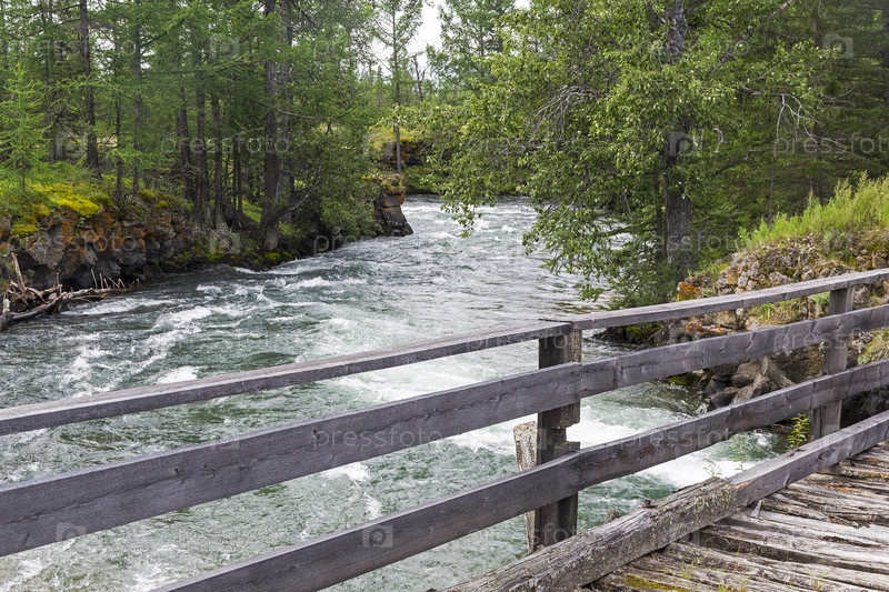 Старый деревянный мост через быструю реку. Река Жомболок, Восточный Саян, Бурятия, Сибирь, Россия