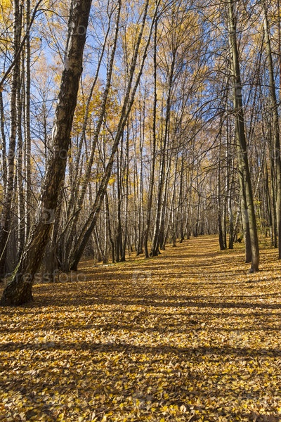 Пешеходная дорожка в ландшафтном заказнике Теплый Стан, засыпанная желтыми опавшими листьями. Солнечный день в октябре. Москва