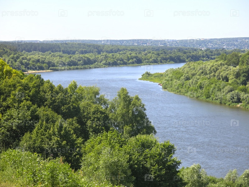 Летняя панорама реки Оки с холмами, полями и деревьями по берегам