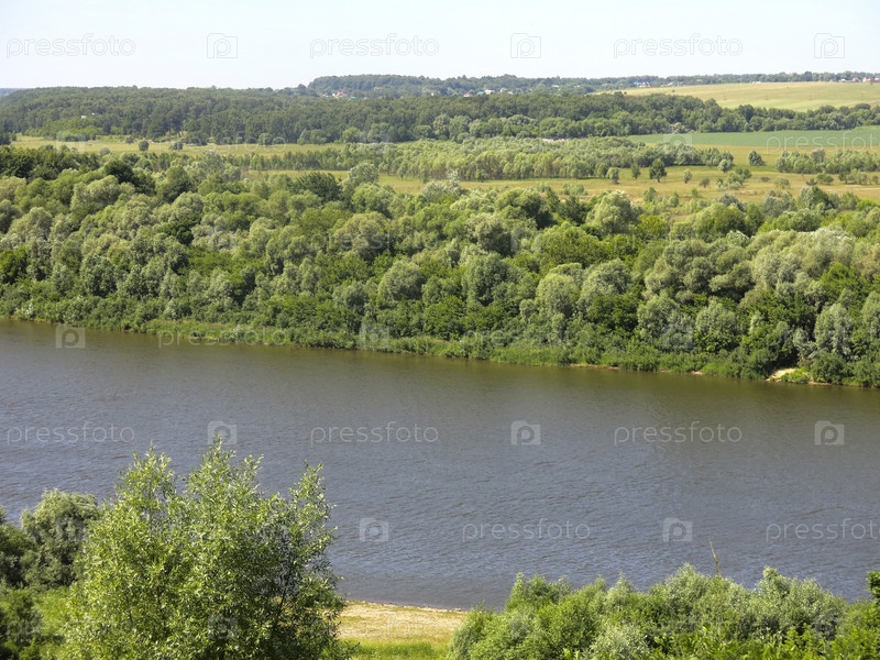 Летняя панорама реки Оки с холмами, полями и деревьями по берегам