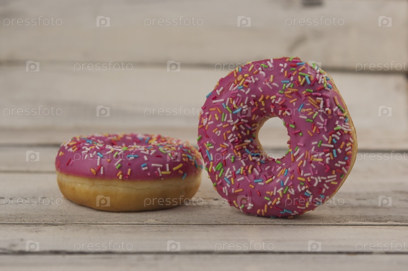 Малиновые пончики на деревянном столе