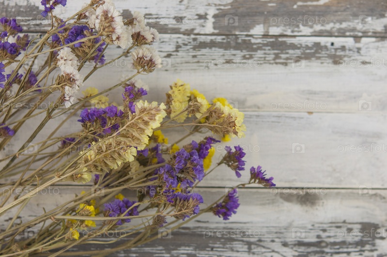 Букет из сухих полевых цветов на фоне белой текстуры старинных деревянных досок вид сверху горизонтальный
