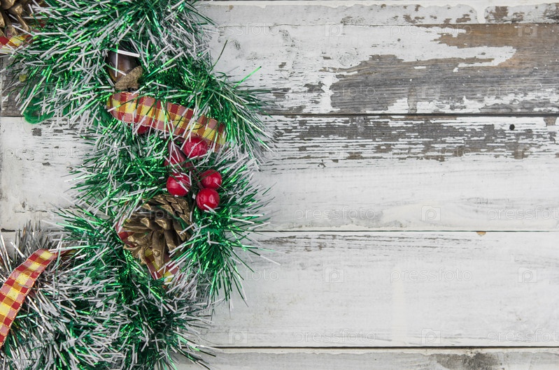 Рождественский венок на деревянном деревенском фоне плоско лежал. Традиционный рождественский венок с красными ягодами и украшениями, сосновыми шишками и хлопком на дереве