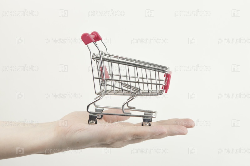 Счастливые покупки. Женская рука держит пустую красную тележку для покупок на белом фоне