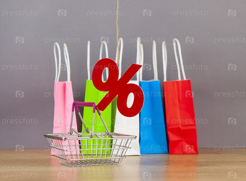 Корзина из супермаркета со знаком процента на сером фоне. Шоппинг в ТРЦ, магазин, шоппинг, большой выбор