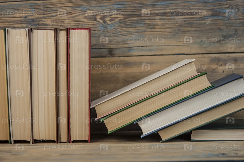 Стопка книг на деревянном столе на деревенском фоне с копией пространства