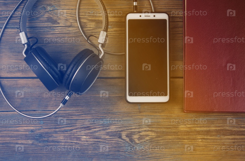 Концепция аудиокниги. Наушники и книга над деревянным столом. Вид сверху с местом для текста