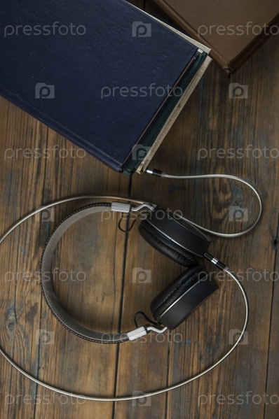 Концепция аудиокниги. Наушники и книга над деревянным столом. Вид сверху с местом для текста