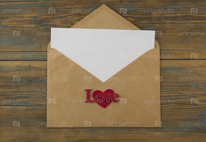 Слово алфавита любви деревянное на коричневой бумажной букве. Фон деревянный стол. День Святого Валентина