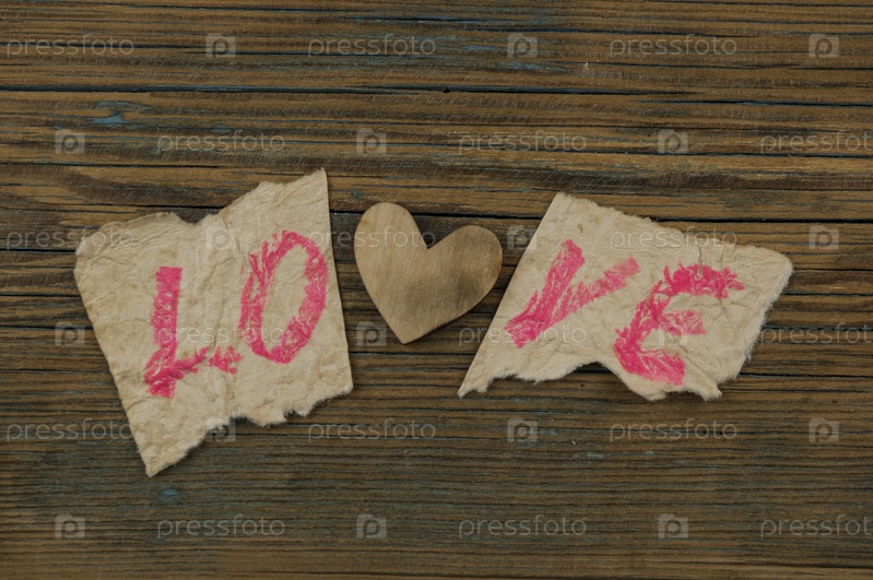 Слово ЛЮБОВЬ написано на рваной бумаге на фоне сердца
