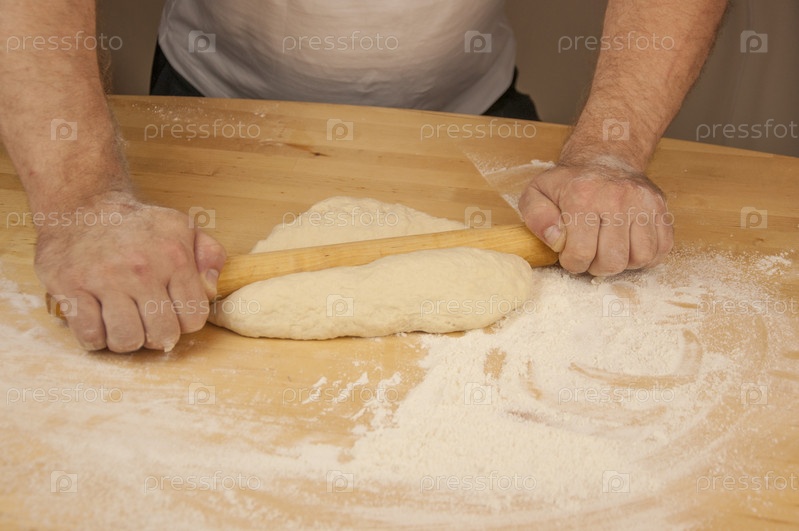 Мужские руки месят тесто скалкой в процессе приготовления пиццы