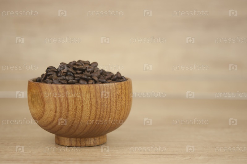 Кофейные зерна в деревянной миске на фоне деревянного стола
