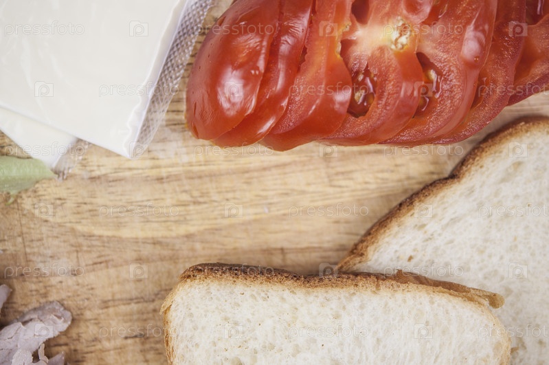 Бутерброд с ветчиной, сыром, помидорами, листьями салата и поджаренным хлебом. Вид сверху на белом фоне
