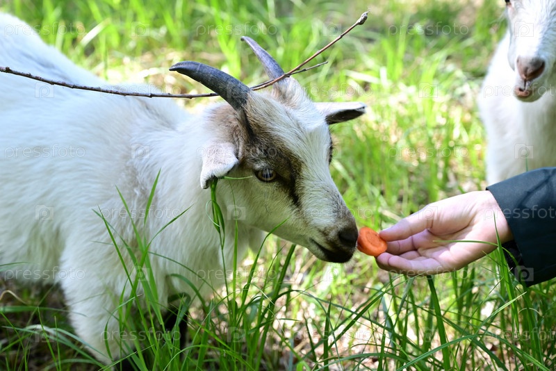 Фермерское животное. Милая маленькая девочка кормит коз на пастбище