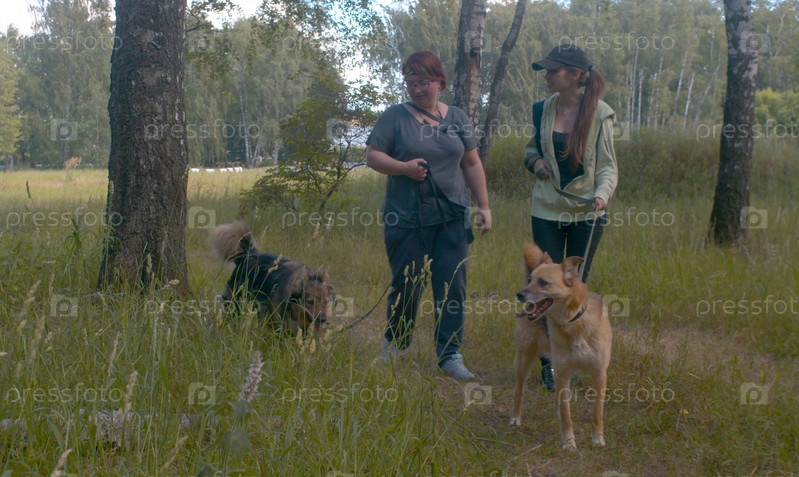 Две женщины-добровольцы гуляют с собаками. Концепция волонтерства и помощи