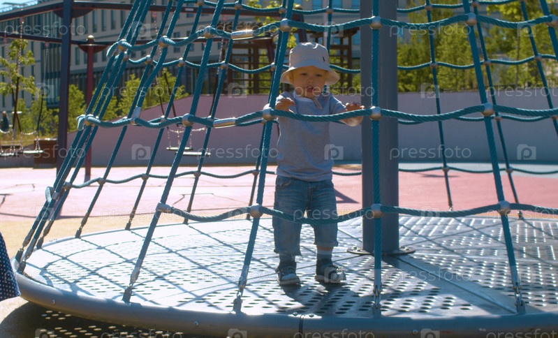 Малыш на карусели на детской площадке в парке