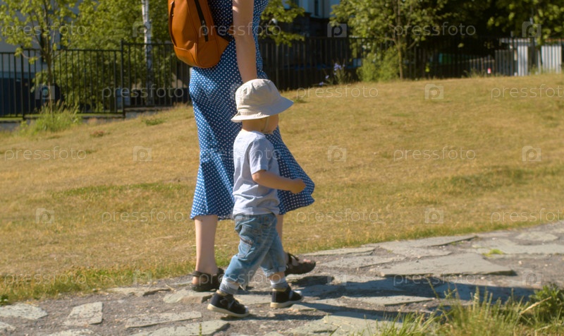 Мальчик и его мама идут по дороге в парке