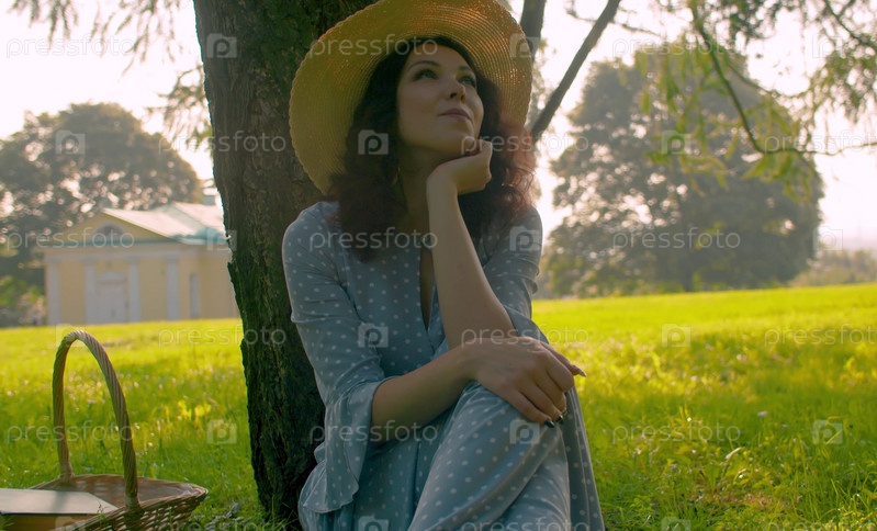 Поэтическая красивая девушка сидит в парке на траве возле сосны. Восход