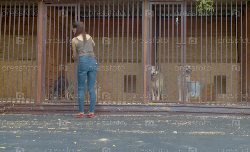Волонтер кормит собак в приюте для собак. Широкий выстрел. Концепция волонтерства и помощи