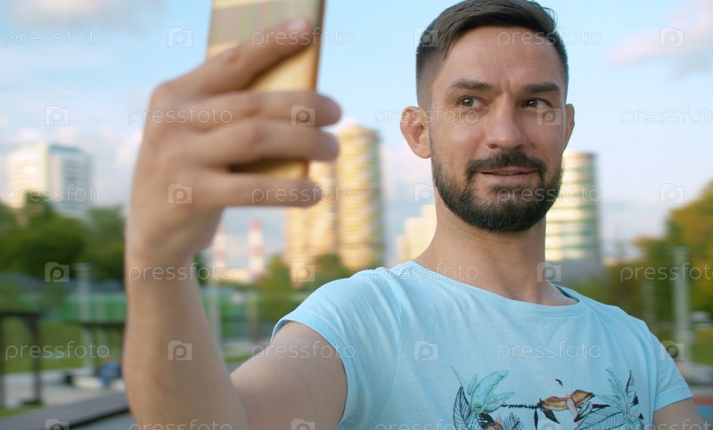 Портрет улыбающегося мужчины, делающего селфи