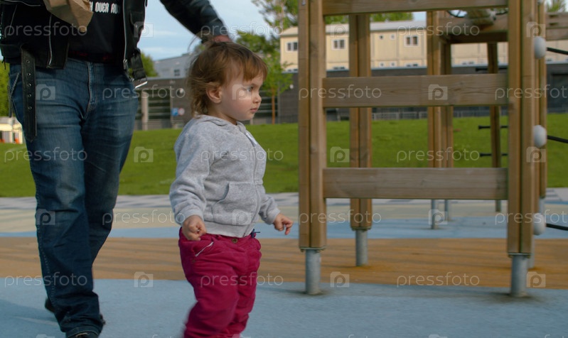 Девочка на детской площадке в парке. Рядом стоит отец. Задний свет