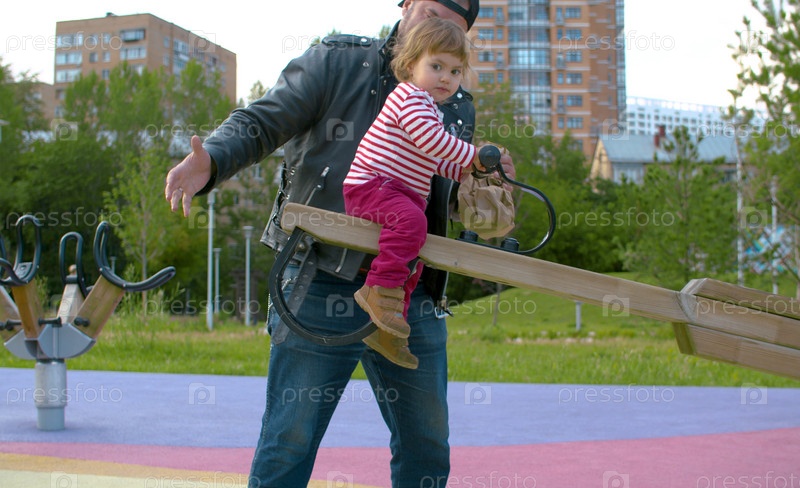 Жестокий отец и маленькая веселая девочка. Папа качает ребенка на качелях и незаконно пьет пиво в парке