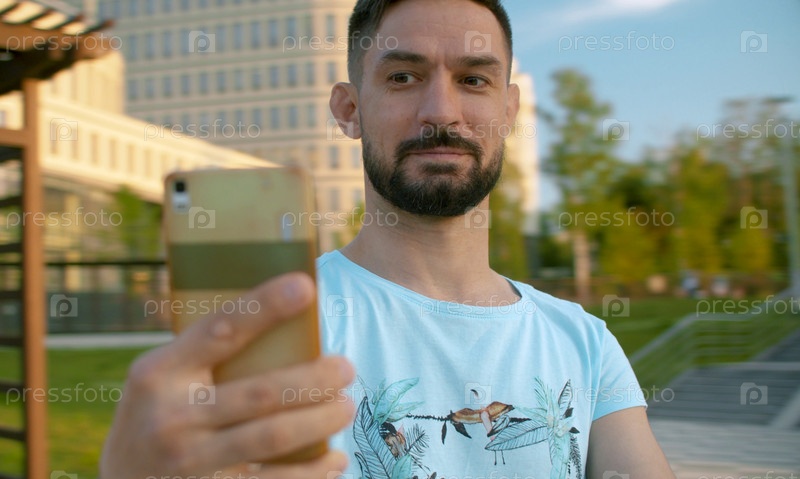 Портрет улыбающегося мужчины, делающего селфи