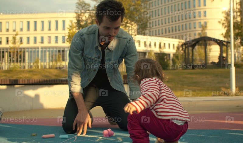 Молодой человек играет с маленькой девочкой в парке