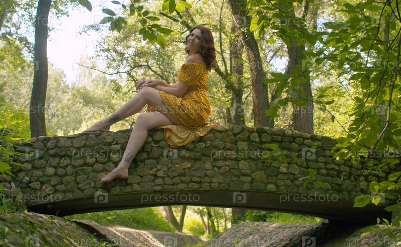 Сельская сцена. Молодая женщина в красивом желтом платье позирует на каменном мосту
