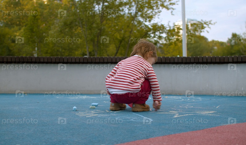 Маленькая девочка мелом на детской площадке в парке. Концепция развития детей