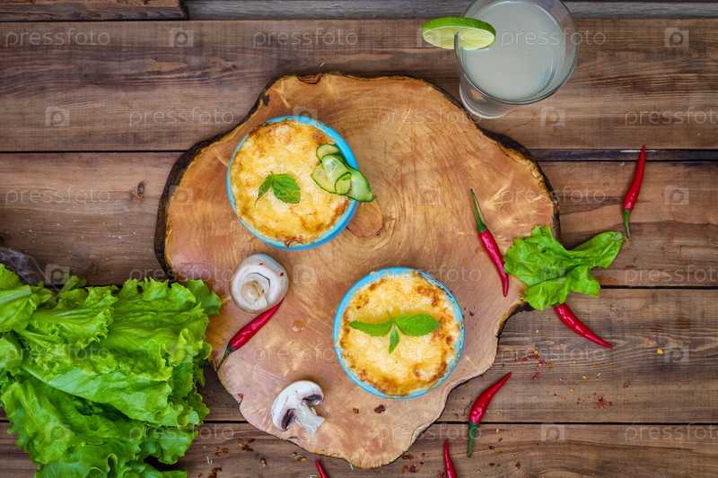 Горшки с жульеном из грибов на деревянной доске. Вид сверху