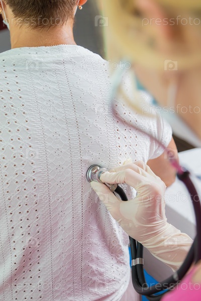 Девушка-врач в маске слушает стетоскопом спину взрослой женщины