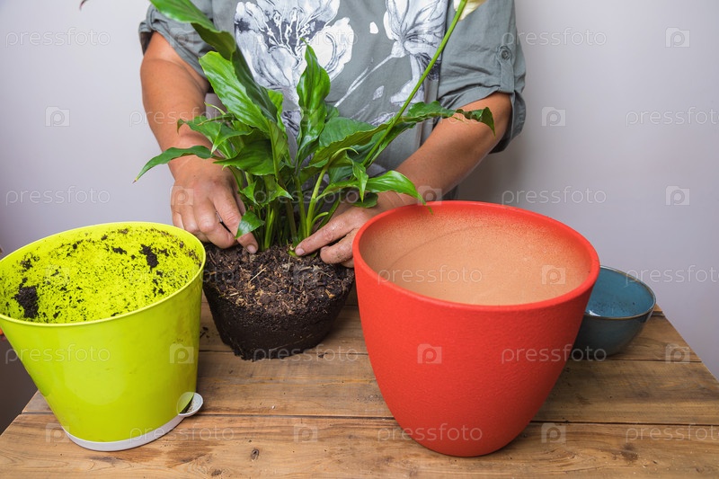 Женщина пересаживает цветок спатифиллума в квадратный цветочный горшок. Цветоводство, крупный план