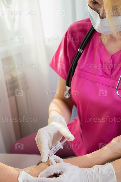Девушка-врач вводит шприц на руке в вену взрослой женщины. Концепция здоровья и медицины. Крупный план