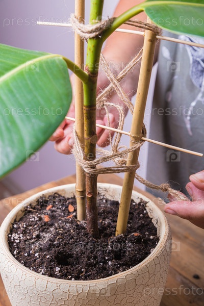 Женщина привязывает веревкой к цветку фикуса опору. Цветоводство. Крупный план
