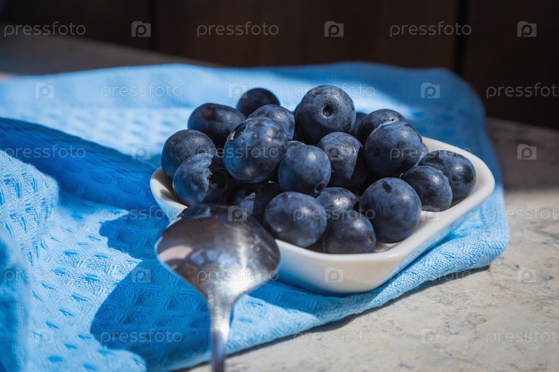 Утренний свежий завтрак со свежей черникой. Черника в белом блюдце на синем фоне