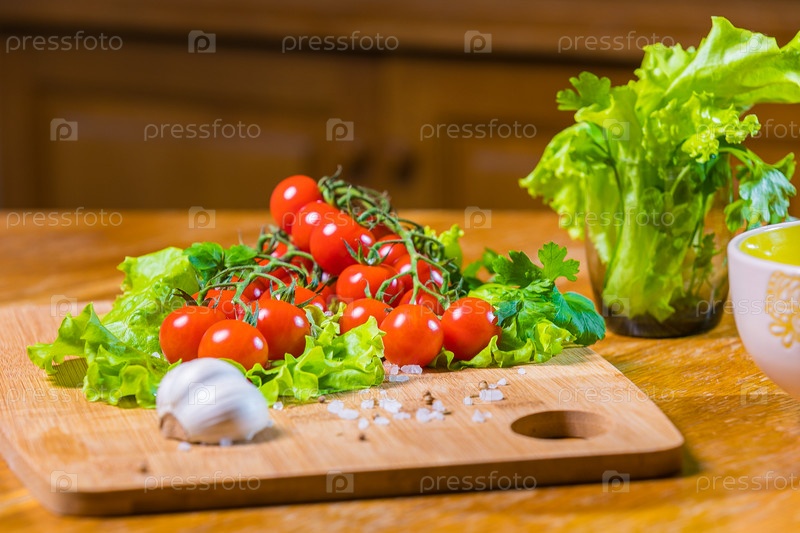 Свежие помидоры черри с зеленым салатом и чесноком на разделочной доске