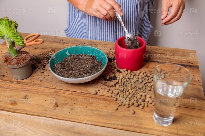 Женщина насыпает землю в новый керамический горшок с пересаженным цветком