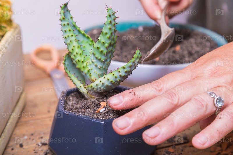 Женщина пересаживает цветок кактуса в небольшой фигурный горшок