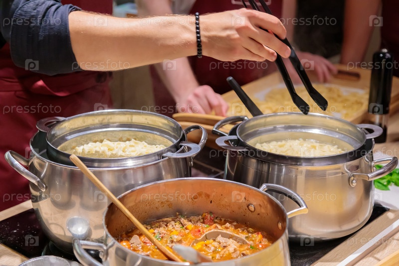 Шеф-повар готовит пасту в больших металлических кастрюлях. Мужские руки вынимают макароны из сковороды щипцами. Крупный план