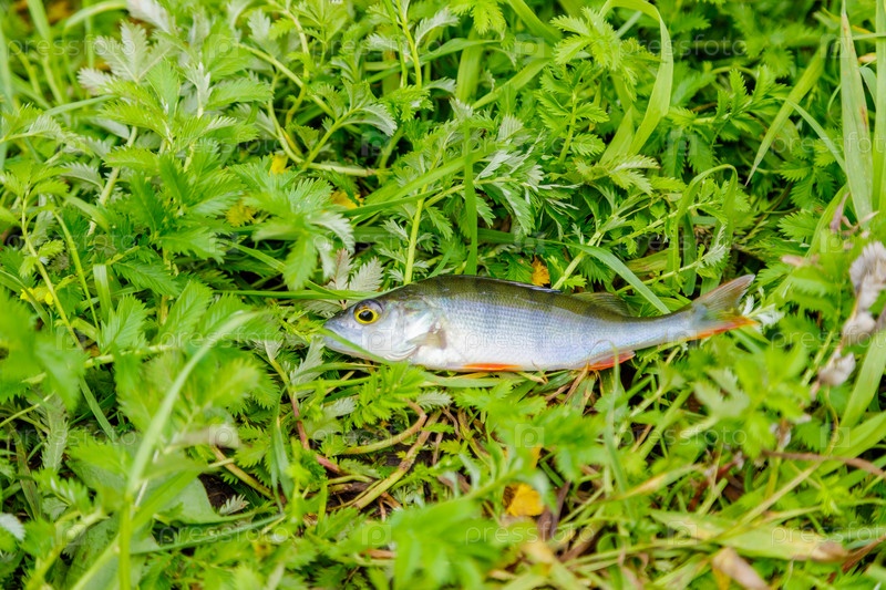 Пойманный окунь лежит в траве на берегу реки. Крупный план