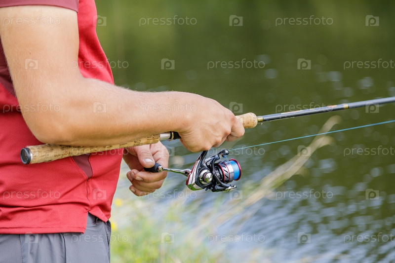 Мужчина с бородой ловит рыбу на реке. Рыбак с удочкой ловит рыбу на берегу реки