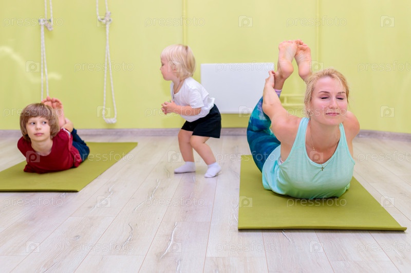 Женщина-инструктор в спортивной форме занимается йогой с мальчиком