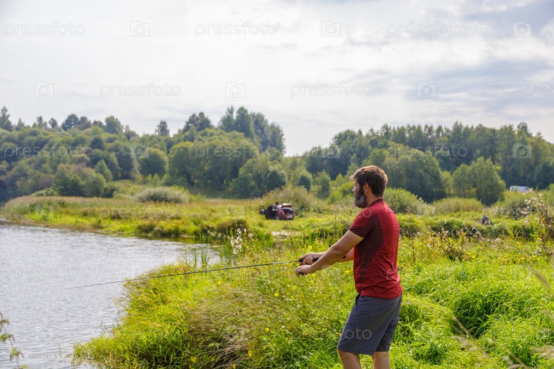 Мужчина с бородой ловит рыбу на реке, забрасывает удочку