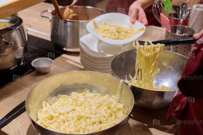 Шеф-повар готовит пасту в больших металлических кастрюлях. Мужские руки выкладывают макароны на тарелку. Крупный план
