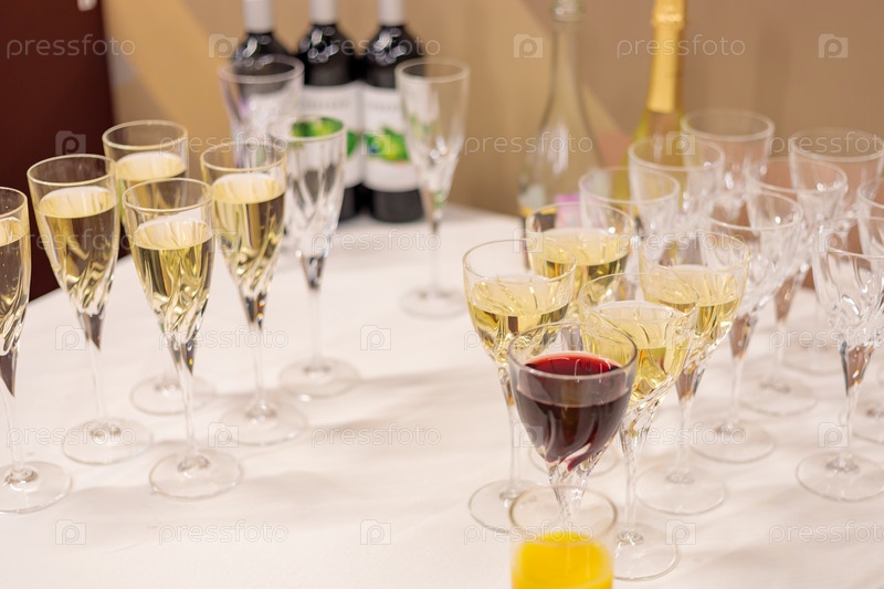 Бокалы с шампанским и белым вином на столе. Корпоративное, праздничное мероприятие