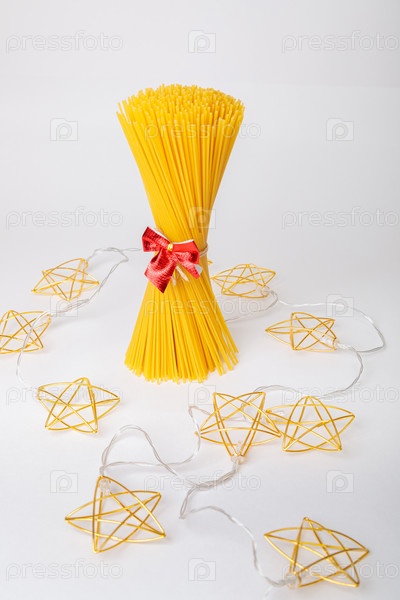 Праздничный букет из сырых спагетти с рождественской гирляндой из звезд