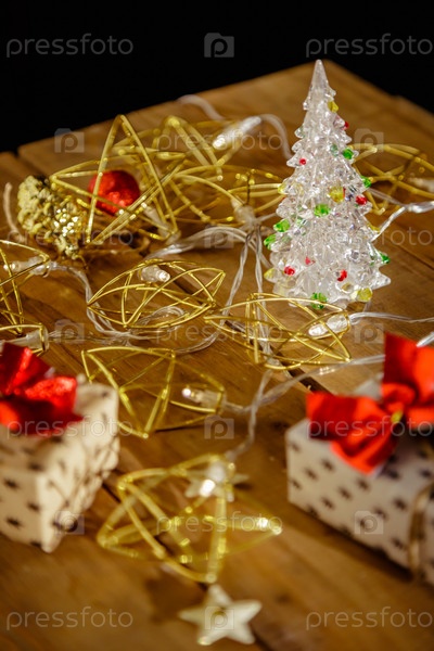 Рождественские новогодние коробки с подарками. Желтая гирлянда и декоративные звезды. Маленький хват, расфокусировка