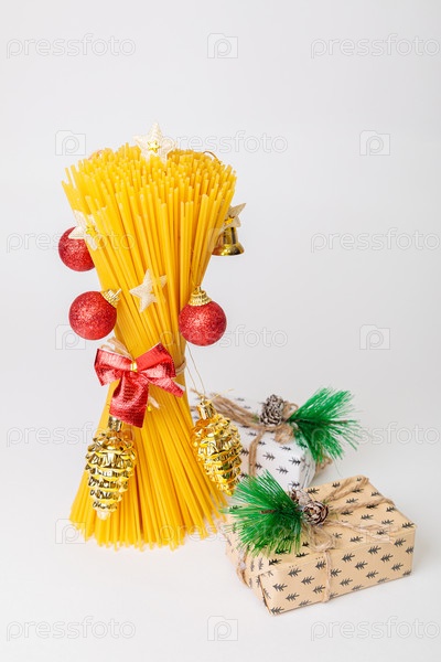 Букет сырых спагетти в форме елки с игрушками, красными шариками и шишками