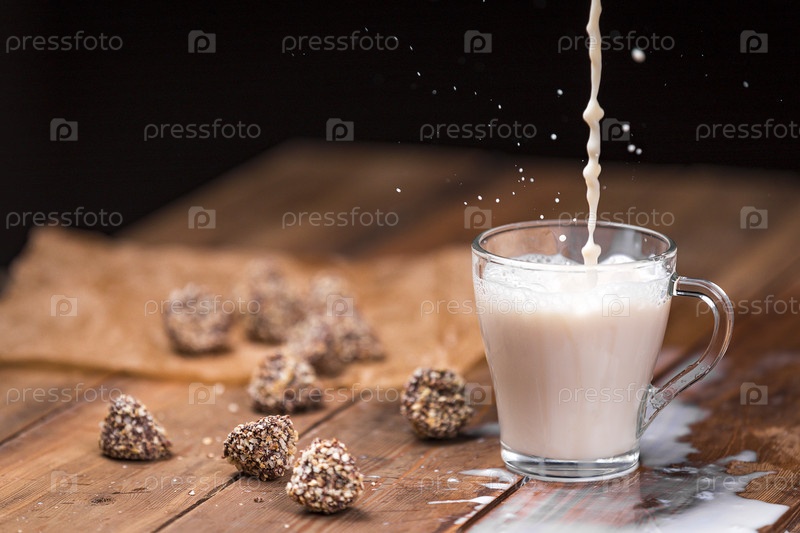 Струя молока льется в стеклянную чашку чая, образуя всплеск. Молоко пролито на деревянный стол. Сладости на столе